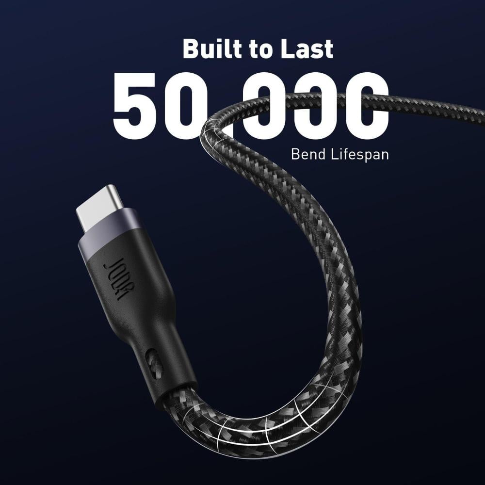 ما يميز هذا الكابل هو تصنيعه من خيوط نايلون عالية الجودة والمتانة. هذا التصميم يمنح الكابل مقاومة استثنائية للطي والتلف، حيث يتحمل ما يصل إلى 50,000 طية دون أي ضرر. الغلاف الخارجي الأسود الأنيق والمتماسك يعزز من هذه المتانة ويمنح الكابل مظهرًا عصريًا وأنيقًا.