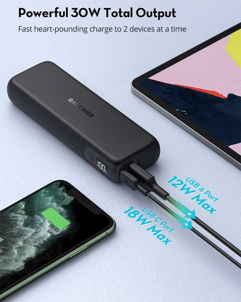 - راف باور يقدم لك شاحن متنقل بحجم صغير وشحن أسرعيستغرق منفذ توصيل الطاقة 15 واط إلى 30 دقيقة فقطلأعادة شحن Iphone 11 pro من 0% إلى 50%بإستخدام كيبل USB-C – lightingمن مميزاته:
