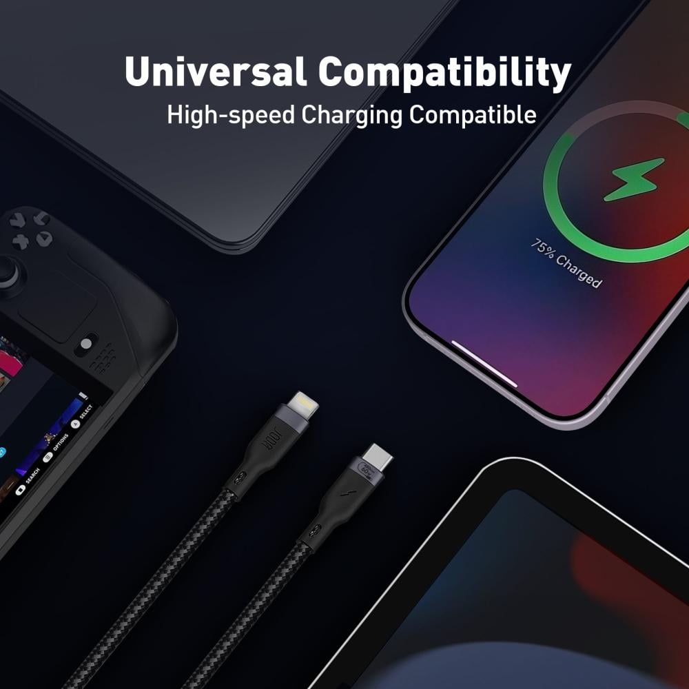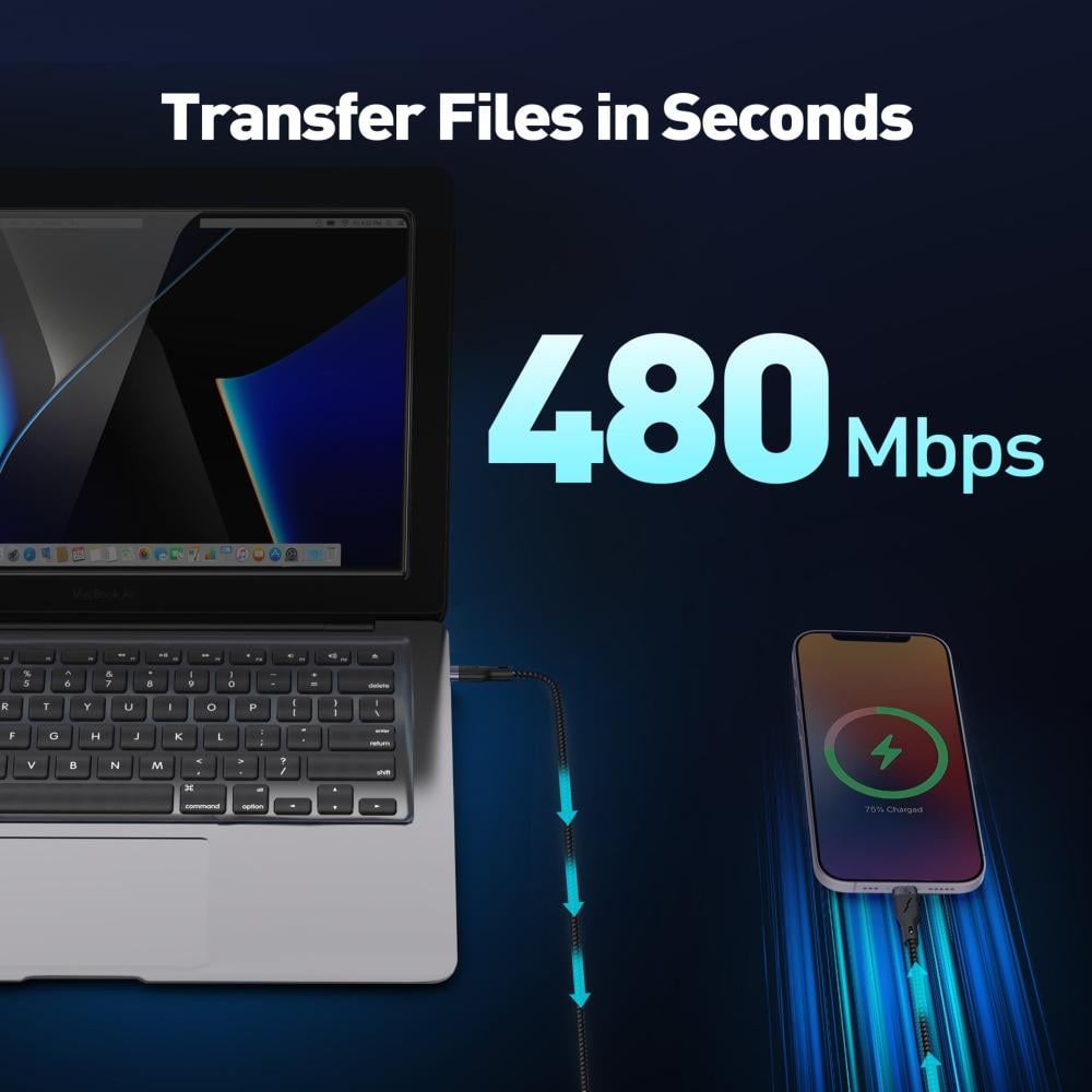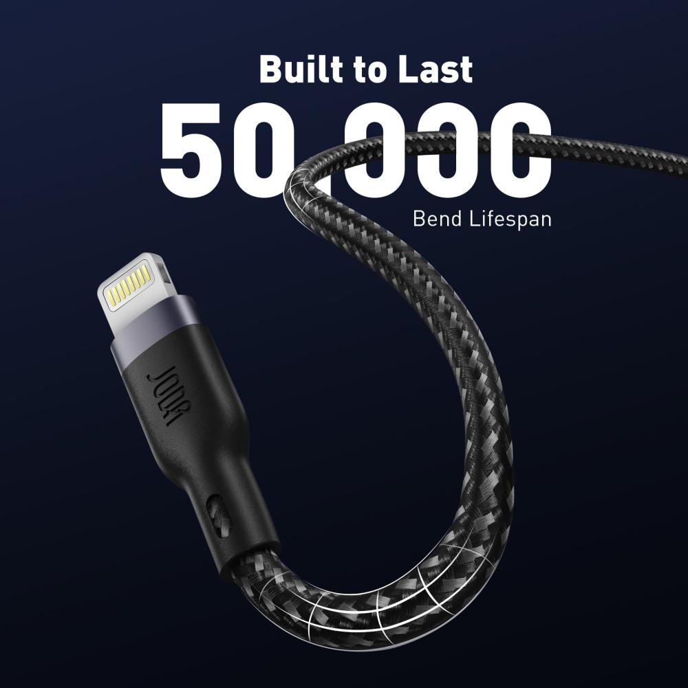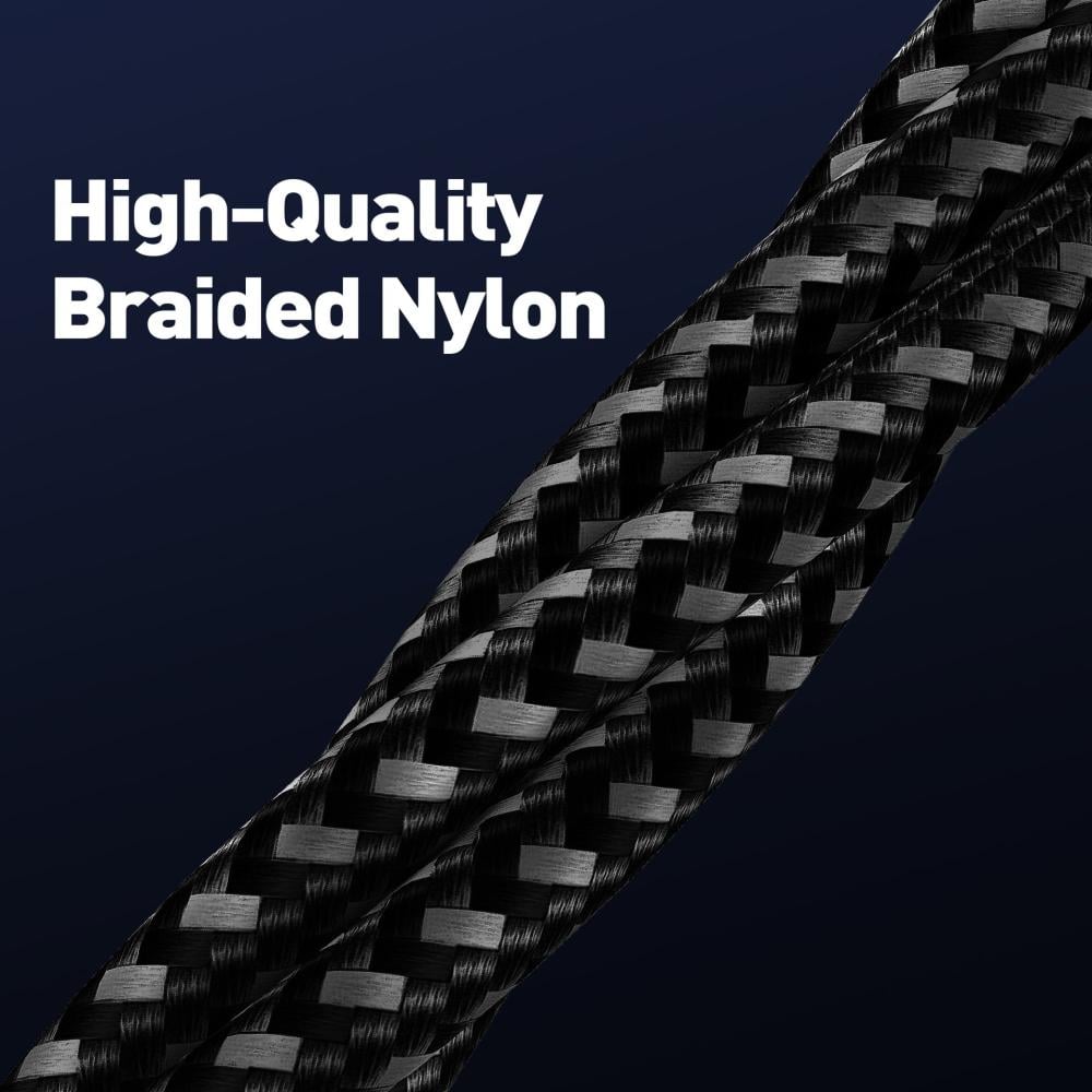 ما يميز هذا الكابل هو تصنيعه من خيوط نايلون عالية الجودة والمتانة. هذا التصميم يمنح الكابل مقاومة استثنائية للطي والتلف، حيث يتحمل ما يصل إلى 50,000 طية دون أي ضرر. الغلاف الخارجي الأسود الأنيق والمتماسك يعزز من هذه المتانة ويمنح الكابل مظهرًا عصريًا وأنيقًا.